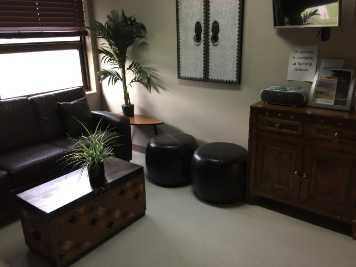 Generous donations have also allowed us to designate and specially decorate a family room for families to gather away from the palliative patient’s room with complete privacy from other public waiting areas. The private family room is furnished with a couch, stools, coffee maker, minifridge, microwave, TV and it’s own private washroom for families to use when in visiting with their loved one.